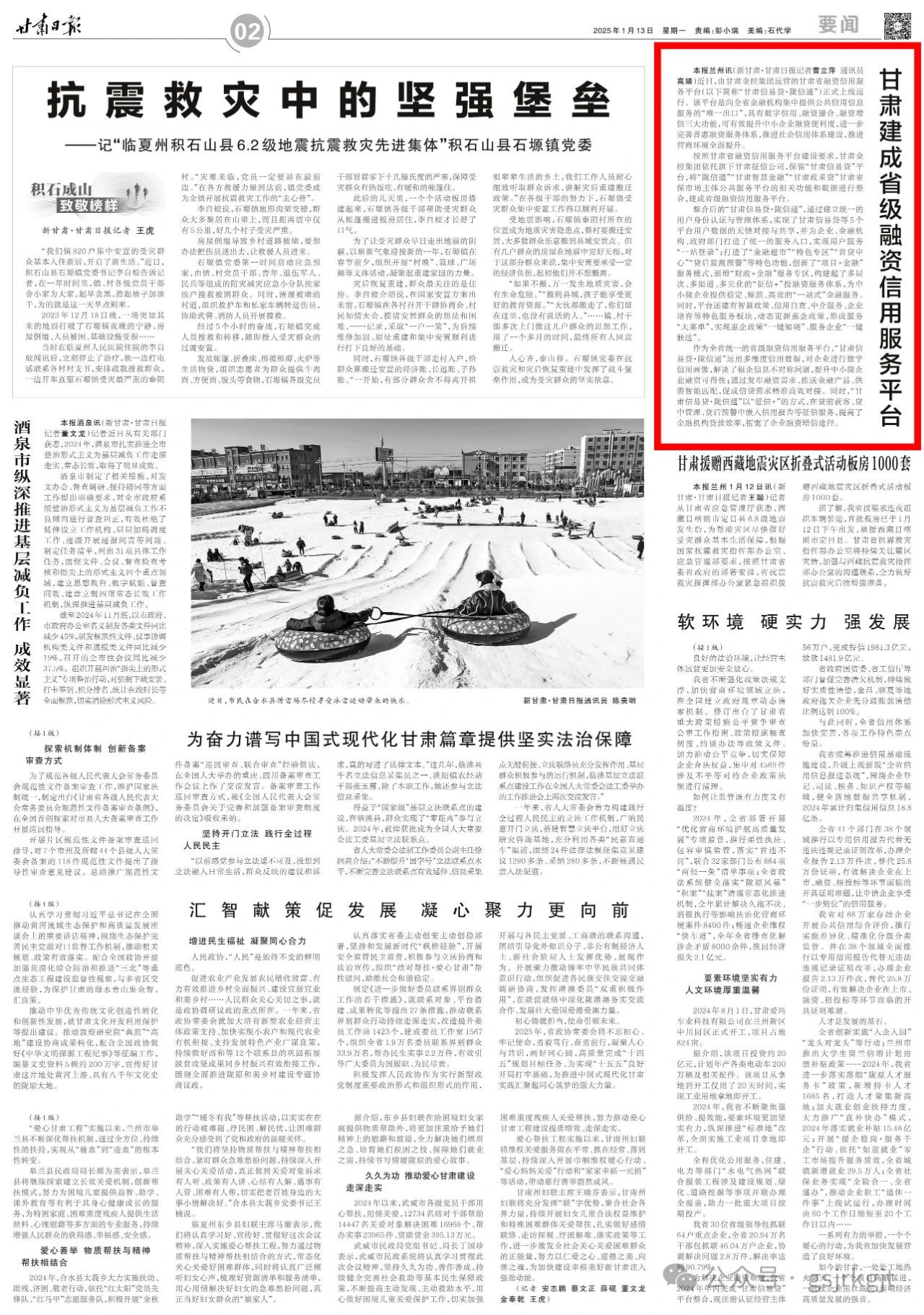 依托旗下甘肃征信公司,保留“甘肃信易贷”平台,将“陇信通”“甘肃智慧金融”“甘肃政采贷”甘肃省保市场主体公共服务平台的相关功能和数据进行整合,建成省级融资信用服务平台。